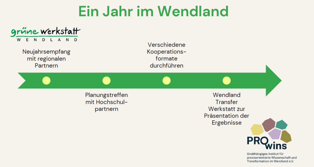 Insgesamt wurde ein großes Interesse an Zusammenarbeit gezeigt. Von dem neuen Institut PROwins erhoffen sich die Teilnehmenden vor allem eine Bündelung des Wissens und der Aktivitäten rund um die Grüne Werkstatt Wendland e. V. und das PROwins Institut Wendland e. V. und stellen sich einen verbindlichen Jahresverlauf der Wissenschaftskooperation wie folgt vor: